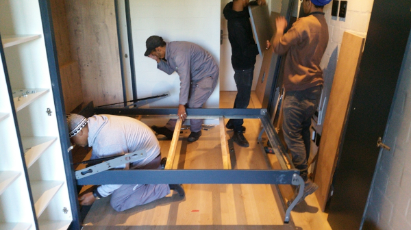 You realise how big a double bed is when it is mounted on a big hinged cupboard door and folds up into the wall to blend in with the rest of the blue built in cupboards in the new unit. The mechanism and action were pretty good but this was without the mattress, bedding and pillows which would have added a lot of bulk and moving parts to the mix. No sign of straps to hold things in place whilst going into a vertical position. The original diagram suggested a sofa that would niftily deploy when the bed was put in an upright position. This was merely a conceptual design. The translation from software hallucination to a real world sofa that would effortlessly come into operation as the bed glided up and away into the wall was not inspiring. A base of upholstered foam with back cushions and no arms was presented. A clunky fusion of futon and beanbag that would get propped up against the bed-cupboard when needed.