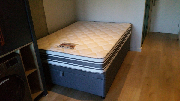 No matter how we tried we couldn’t arrive at a logical workflow that would accommodate this setup of bed, desk and floppy sofa. The solution? Rip it out and put in a normal bed. The carpenters that did the development were still on site and and they quickly came up with a redisgn of the affected area and related cupboards. The new, normal bed was going to go up against the wall in the corner. One tall cupboard would have to go but there would be increased shelf space above the length of the bed. In such a small unit where storage space is critical think of getting a bed with a base that opens up. It costs a bit more but opens with the aid of hydraulic arms (like in car boots) and has a large volume. Perfect for eating up unpacked suitcases and other things that aren’t needed on a day to day basis.